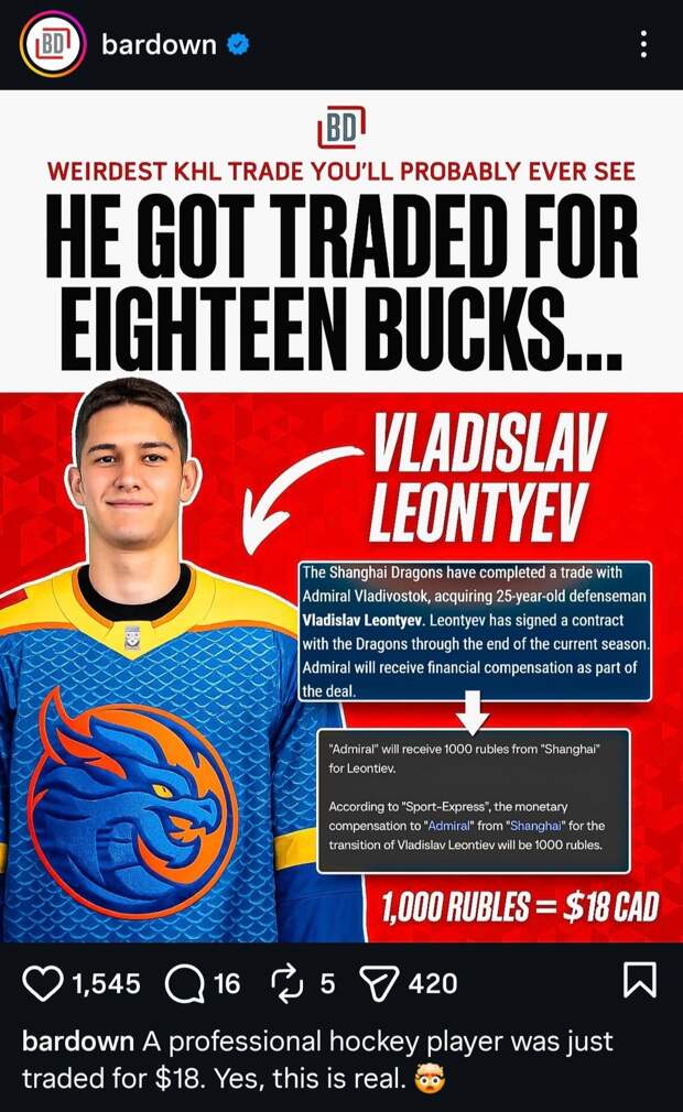 «Моряки» начали распродажу игроков, за последние несколько дней из «Адмирала» в другие команды перешли шесть хоккеистов. В столичный «Спартак» отправился лучший бомбардир команды Даниил Гутик, в обратном направлении последовали защитник Никита Ефремов и нападающие Егор Чезганов и Даниэль Усманов. Поучаствовали в закупке хоккеистов «Адмирала» и петербургские команды: в СКА переехал защитник Павел Коледов в обмен на денежную компенсацию, а игроком «Шанхай Дрэгонс» стал Владислав Леонтьев — тоже в обмен на деньги. Причем этот обмен неожиданно удивил… Северную Америку! Инсайдеры сообщили, что компенсация составила символическую 1000 рублей, что достаточно частая практика последних лет в КХЛ. Но в канадском паблике Bardown крайне удивились подобному, подписав новость: «Дичайший переход КХЛ, который вы когда-либо видели. Его обменяли за 18 баксов», — речь идет о канадских долларах.